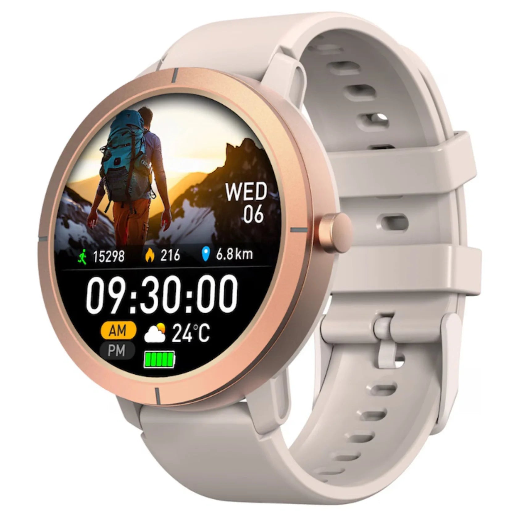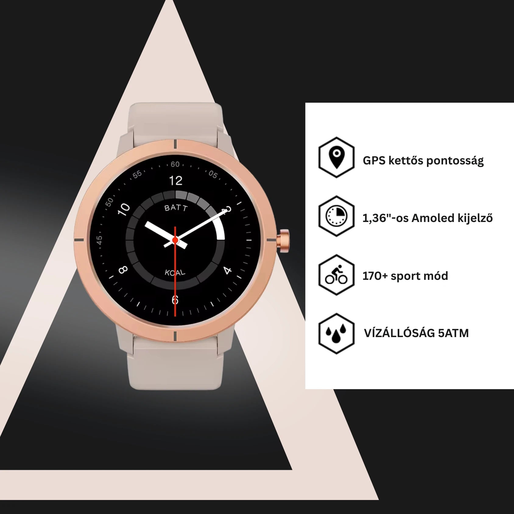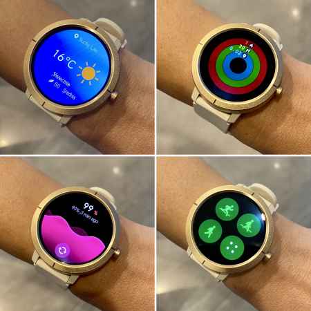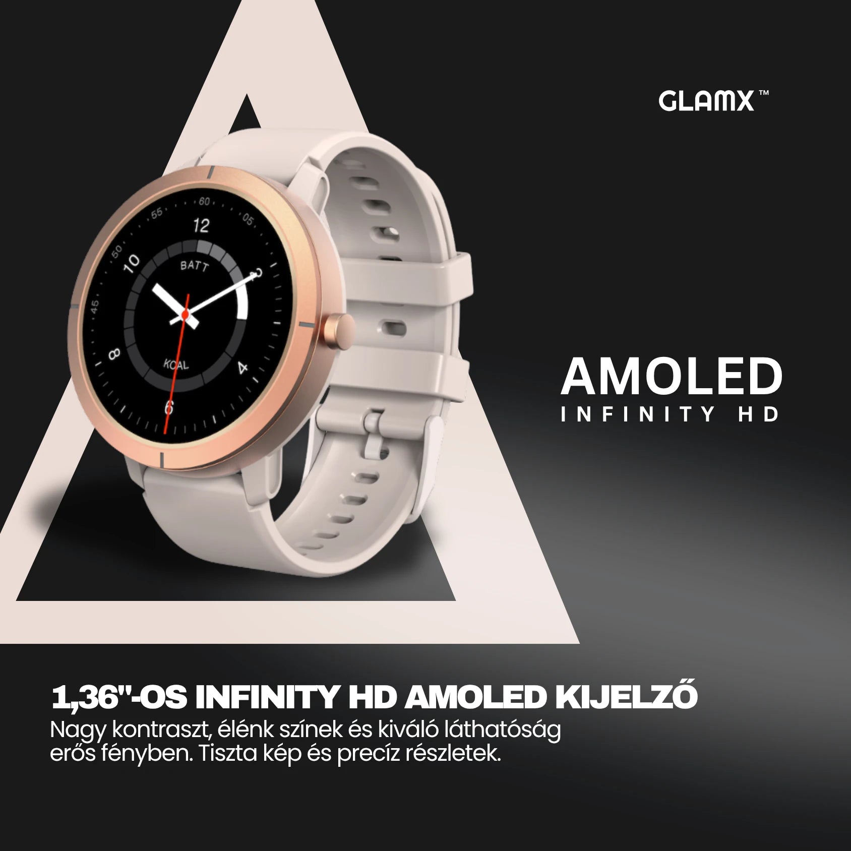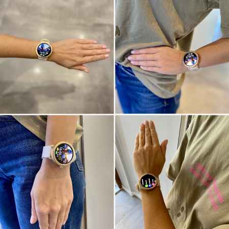 A 1,43 hüvelykes, tiszta AMOLED kijelző élénk színeket és kiváló kontrasztot biztosít, amely még erős napfényben is jól látható.